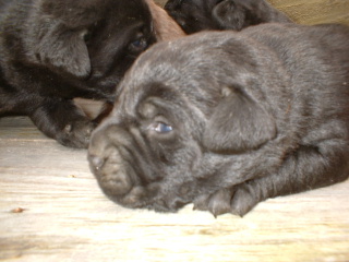 | Puppies at 2 weeks old. They are just now opening their eyes. |