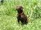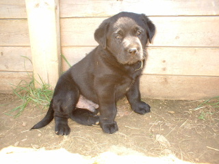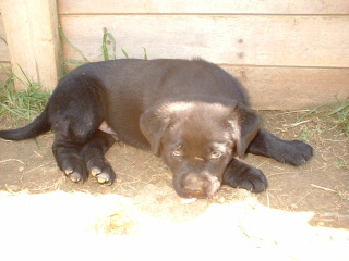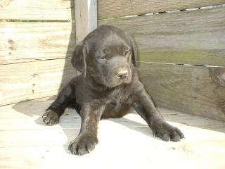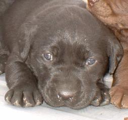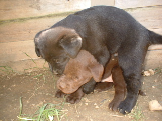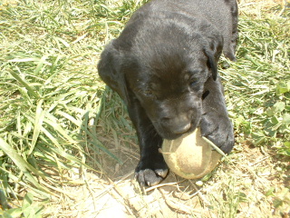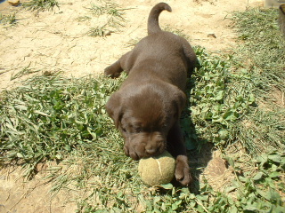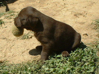 | The puppies are now 5 1/2 weeks old. This is the chocolate female playing with the tennis ball. She can't get it in her mouth yet, but she can hold it by the fuzzy stuff. |